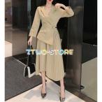 レディース ワンピース 長袖 ミドル丈 スーツスカート ツーピース風 プリーツドレス カーキ アシンメトリー 着痩せ 無地 上品 エレガント きれいめ 通勤 S-L