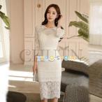 レースワンピース タイトワンピース膝丈 パーティードレススリム レースパーティードレス結婚式 七分袖 丸首 着痩せ セクシー エレガント 韓国風 気質