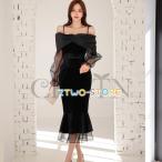 キャミソールワンピース ヒップラップ マーメイド 肩出し シースルー 無地 スリム 袖あり パーティードレス 着痩せ 夏物 二次会 食事会 タイトワンピースロング