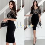 レースタイトワンピース膝丈タイトワンピース7分袖パーティードレススリットワンピース黒 レースタイトワンピース 二次会 着痩せ 飲み会 入学式 卒業式 夏