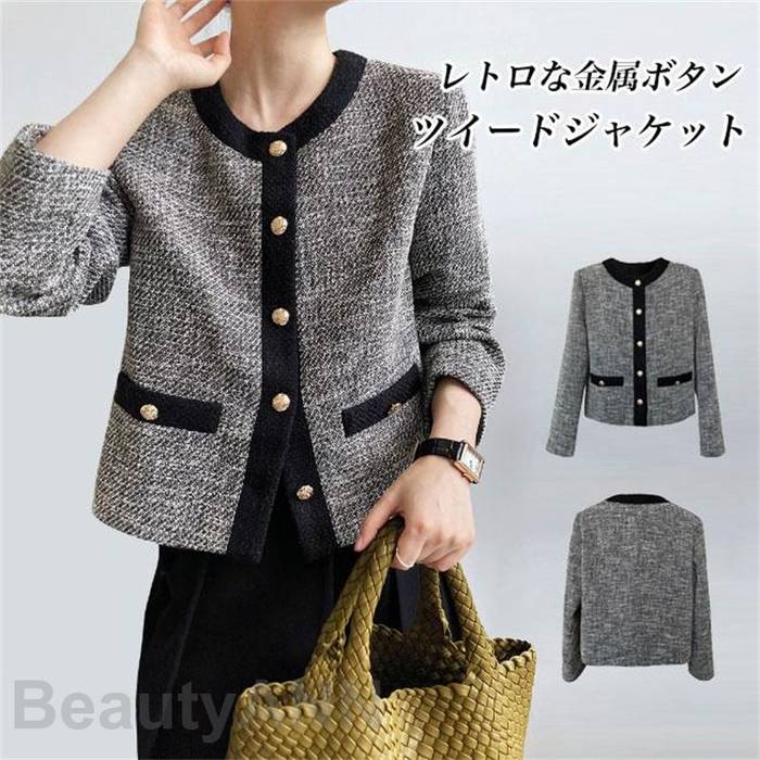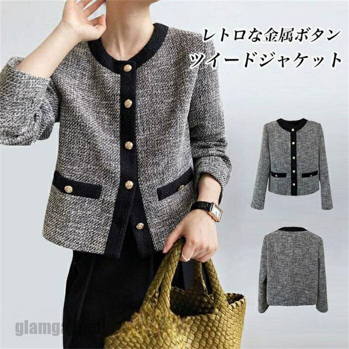 ツイードジャケット レディース ジャケット 秋 春 ノーカラージャケット キレイめ ツイード アウター ショート 通勤 レトロ フレンチ風 金属ボタン プレゼント ギフト 母の日