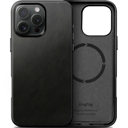Kingflag iPhone 16 Pro Max対応 本革レザーケース MagSafe対応、オイルワックス仕上げ、金属ボタンとレンズ保護エッジ、マイクロファイバー内張り、フルレザーカバー (クラシックブラック, 16 Pro Ma