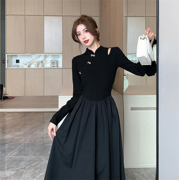 着痩せ効果 中国風 縷空 つなぎ 金属ボタン デザインセンス ロングスカート 快適である 長袖 ワンピース