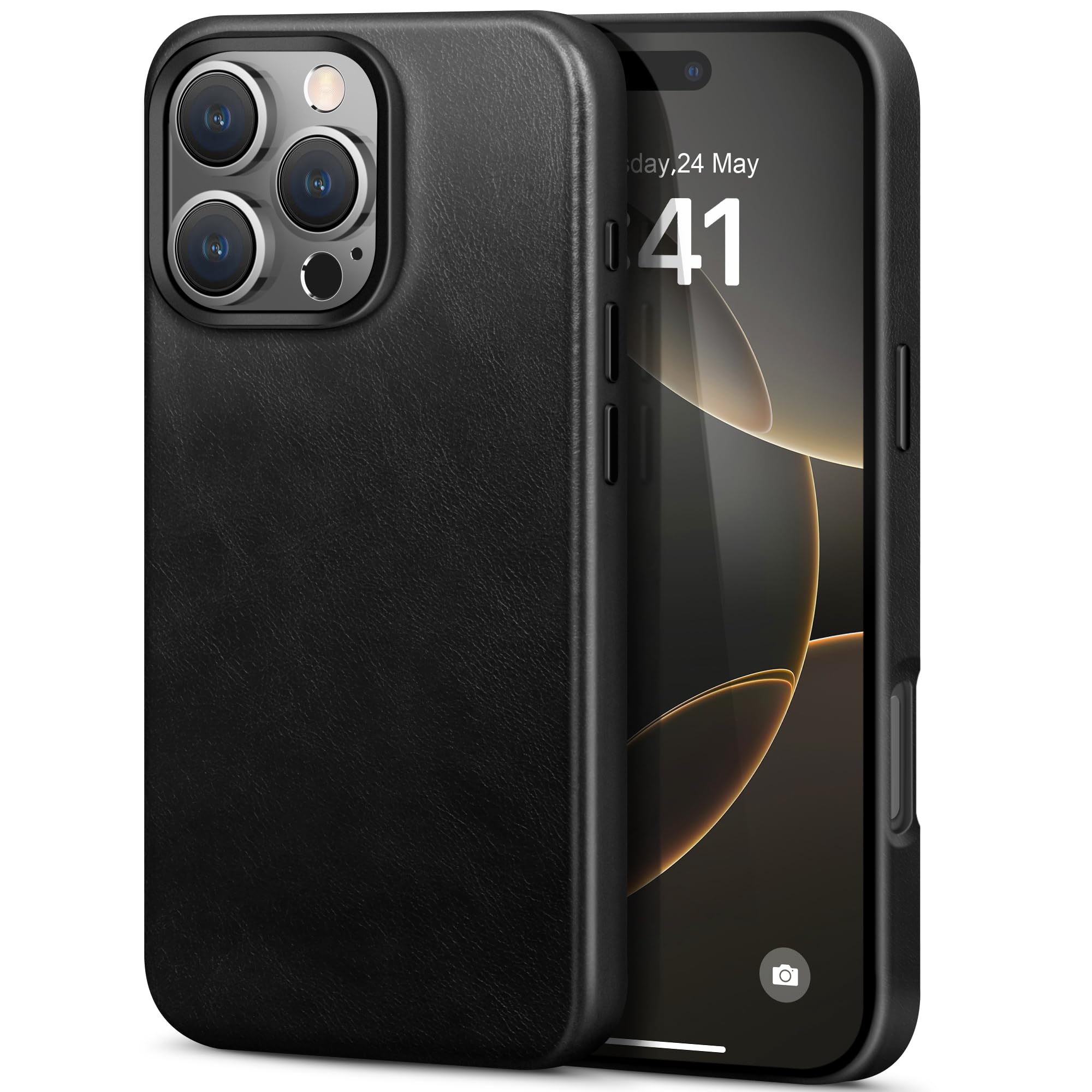 Kingflag iPhone 16 Pro対応 本革レザーケース MagSafe対応、オイルワックス仕上げ、金属ボタンとレンズ保護エッジ、マイクロファイバー内張り、フルレザーカバー (クラシックブラック, 16 Pro)