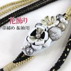 帯締め 振袖用 -5A- 花飾り つまみ細工 パールビーズ 絹100% 丸組紐 4本バラ 黒軸/白