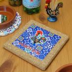 ポルトガル製 ポットプレート 15cm 鍋敷き 幸せを呼ぶニワトリ 雄鶏 カラフル 耐熱 絵タイル コルクフレーム ナベシキ pmc-8648g