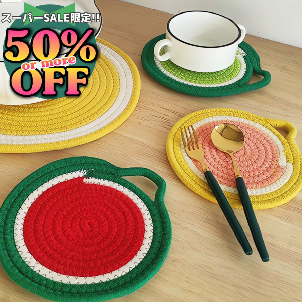 6%OFFクーポン★ひとまわり大きなロープ巻きでフルーツのポットマット。鍋敷きにもコースターにも。 おしゃれ かわいい フルーツ 果物 ロープ キュート_ ギフト 大きめ