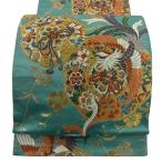 袋帯 名品 じゅらく 落款あり 瑞鳥鏡華文様 金糸 箔 緑 六通 正絹 中古