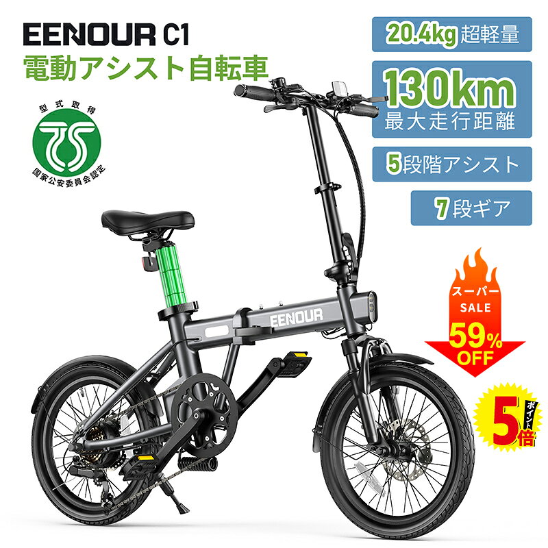 スーパーSALE!1/2当選率抽選P100%返還+59%OFF+P5倍【20.4kg軽量★型式認定】 EENOUR C1 電動アシスト自転車 軽量 折りたたみ 16インチ 電動自転車 サスペンション 5段アシスト 7段シマノ変速ギア 防犯登録 電動バイク 免許不要 130km走行 350Wモーター 側面内蔵ライト 通勤