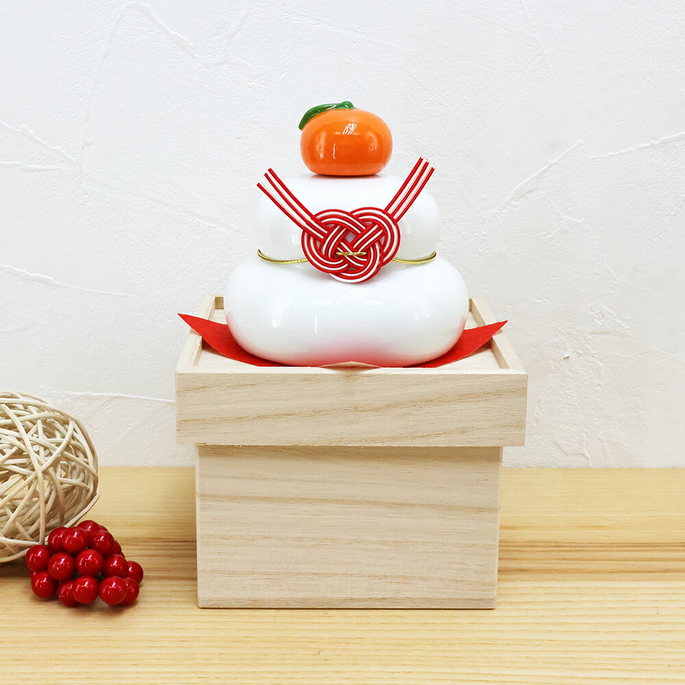 【楽天スーパーSALE限定20%OFF】 鏡餅 置物 正月飾り 迎春飾り 鏡餅飾り 収納桐箱台付 陶器製 高さ17.5cm 木札特典付き かわいい おしゃれ 干支置物 お正月飾り 十二支 縁起物 開運 金運 ディスプレイ 部屋飾り 玄関飾り 薬師釜 .鏡餅.