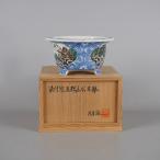 盆栽鉢 月香 小型 長辺 約12.2cm 丸鉢 染付 窓抜 五彩 山水図 共箱 観賞用 現品 新品