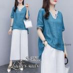 セットアップ レディース ブラウス 夏 麻 リネン パンツスーツ ワイドパンツ 夏コーデ 2点セット 入学式 服 母 シフォン おしゃれ オフィス 通勤 OL 40代