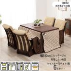 ダイニングこたつ 6点セット 幅150cm 長方形 ブラウン 天然木タモ材突板 専用ふとん キャスター付レザーチェア SHIRO