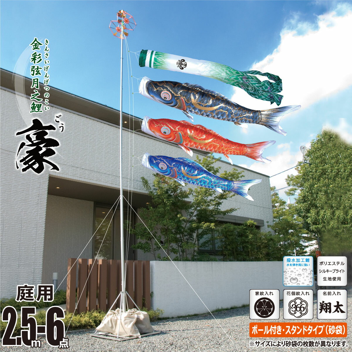 鯉のぼり 庭用 豪(ごう) 2.5m 6点 庭園用 スタンドセット 吹流し+鯉3匹+矢車+ロープ+ポール+庭園用スタンド(砂袋付き)セット徳永鯉のぼり カタログ 純正品 ポリエステル 撥水加工 家紋/花個紋/名前入れ対応 日本製 KOT-GS-116-171