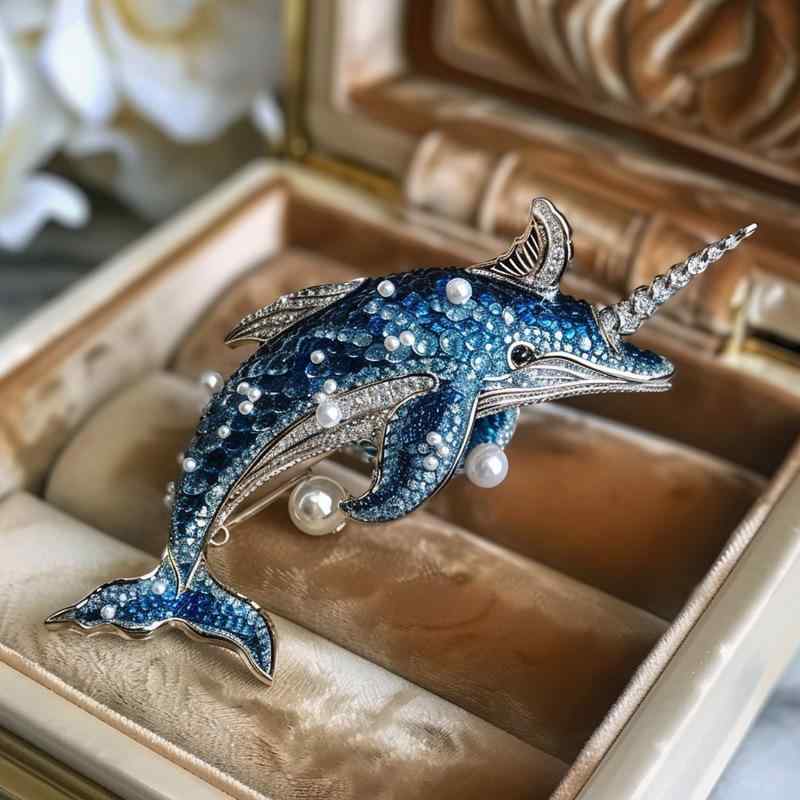 ブローチ 男女兼用 一角鯨 鯨 銅製 琺瑯 ジルコニア 電気メッキ加工 高級感 上品 エレガント 海洋生物 動物 多機能 装飾 ファッション 通勤 アクセサリー 小物