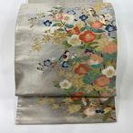 袋帯 秀品 椿 鳥 金糸 箔 銀色 お太鼓柄 正絹 中古