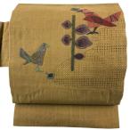 美品 名古屋帯 秀品 紬地 鳥 草花 刺繍 山吹茶色 正絹 中古
