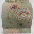 美品 袋帯 秀品 華文 向かい鳥 唐織 箔 薄緑 六通 正絹 中古