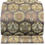 美品 袋帯 名品 動物 花 箔 黄土色 六通 正絹 中古