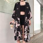 レディースファッション 和柄 ガウン ロング丈 トップス 羽織 ジャケット 長袖 薄手 鶴 柄 カッコイイ 個性的 和風 オリエンタル 鳥 総柄 派手 目立つ