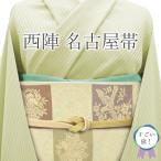 すごい値! 名古屋帯 九寸 未使用 正絹 西陣 薄灰緑 花喰い鳥 草花 市松 織り柄 新古品 セミフォーマル 仕立て上がり みやがわ neb01530