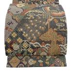 美品 名古屋帯 逸品 動物 花 墨色 正絹 中古