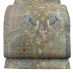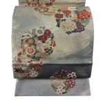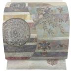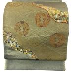 美品 袋帯 秀品 花丸文 鳥 金銀糸 箔 灰緑 六通 正絹 中古