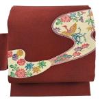 美品 袋帯 秀品 鳥 よろけ縞 箔 えんじ色 六通 正絹 中古