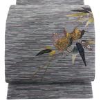 美品 袋帯 秀品 鳥 草花 銀糸 青灰色 六通 正絹 中古