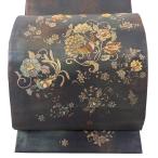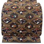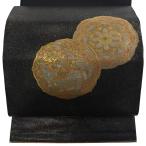 美品 袋帯 秀品 華文 鳥 螺鈿箔 箔 黒 お太鼓柄 正絹 中古