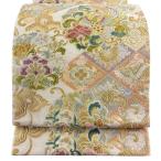 袋帯 名品 草花 鳥 刺繍 金銀糸 クリーム 六通 正絹 中古
