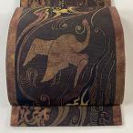 美品 袋帯 逸品 桝屋高尾 落款あり 鳥 動物 金糸 箔 焦茶色 六通 正絹 中古