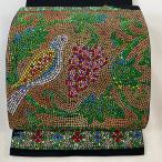 袋帯 逸品 龍村美術織物 落款あり たつむら 本袋 葡萄華鳥錦 銀糸 箔 黒 お太鼓柄 正絹 中古