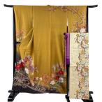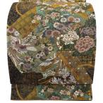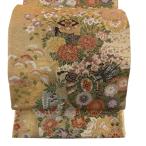 美品 袋帯 秀品 花鳥 鼓 金糸 箔 金茶 全通 正絹 中古