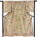 小紋 身丈152.5cm 裄丈63cm S 袷 草花 鼓 ちりめん 薄緑 正絹 優品 中古