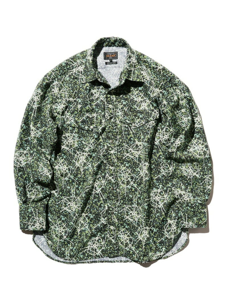 【SALE/30%OFF】BEAMS PLUS BEMAS PLUS | 抜染 ジュイプリント デニム ワークシャツ ビームス メン トップス シャツ・ブラウス グリーン ネイビー【RBA_E】【送料無料】