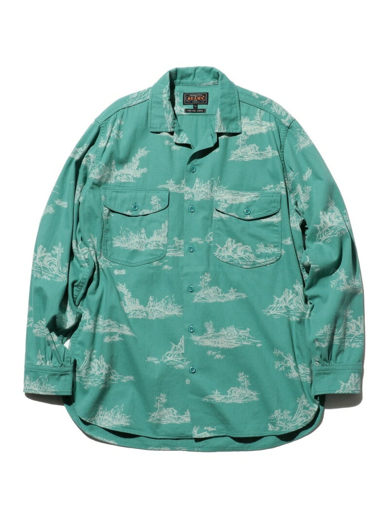 【SALE/30%OFF】BEAMS PLUS BEMAS PLUS | 抜染 ジュイプリント デニム ワークシャツ ビームス メン トップス シャツ・ブラウス グリーン ネイビー【送料無料】