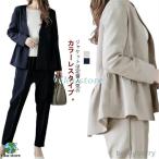 2点セット スーツ レディース セットアップ セットアップスーツ 上下セット 長袖 ジャケット ノーカラー ボタン ペプラム テーパード パンツ ロン