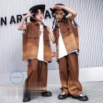 キッズ ダンス衣装 ヒップホップ 派手 ブラウン デニムベスト ロング丈パンツ 短パンツ HIPHOP K-POP 男の子 女の子 グラデーション ステージ衣装 演出服