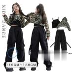 キッズダンス衣装 ヒップホップ カモフラージュ柄 迷彩柄パーカー へそ出し 黒カーゴパンツ チアガール 女の子 K-POP セットアップレッスン着 演出服 発表会