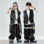 キッズダンス衣装 k-pop衣装 HIPHOP ヒップホップ 子供服 男の子 女の子 白Tシャツ 黒レザー ベスト カーゴパンツ ステージ衣装 練習着 舞台衣装