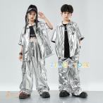 キッズダンス衣装 k-pop衣装 HIPHOP ヒップホップ 男の子 女の子 シルバー 銀 レザー ジャケット カーゴパンツ ステージ衣装 練習着 舞台衣装