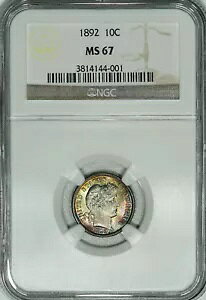 1892 NGC MS67 バーバーダイム、非常に光沢のあるオリジナル、美しいオリジナルの色調