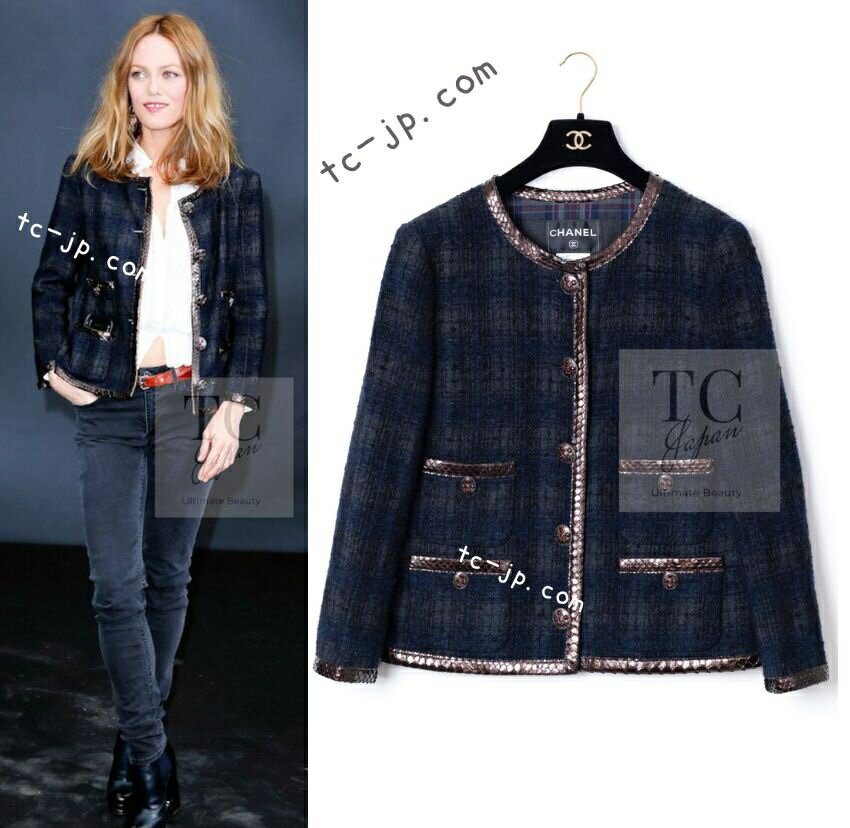 [中古] シャネル ジャケット CHANEL ネイビー グレー ブラック ウール アルパカ パイソン トリム グリポア宝石ボタン カール・ラガーフェルド 超美品 38