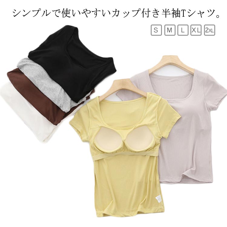 カップ付き 半袖 Tシャツ カップ付きtシャツ スクエアカラートップス レディース ブラトップ スクエアネック タイトフィット トップス Tシャツ 無