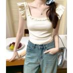 tシャツ スクエア ネック フリル 半袖 Tシャツ レディース