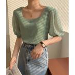 tシャツ 編みベルト付き 半袖 パフスリーブ シアー ブラウス レディース