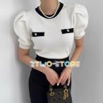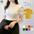 ニット レディース パフスリーブ 半袖 リブニット プチハイネック バルーン袖 無地 トップス ぽわん袖 コーデ