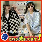 ニット ベスト レディース セーター トップス チェック柄 前開け 着痩せ ノースリープ ゆったり 秋服 ショット丈 おしゃれ カジュアル 仕事